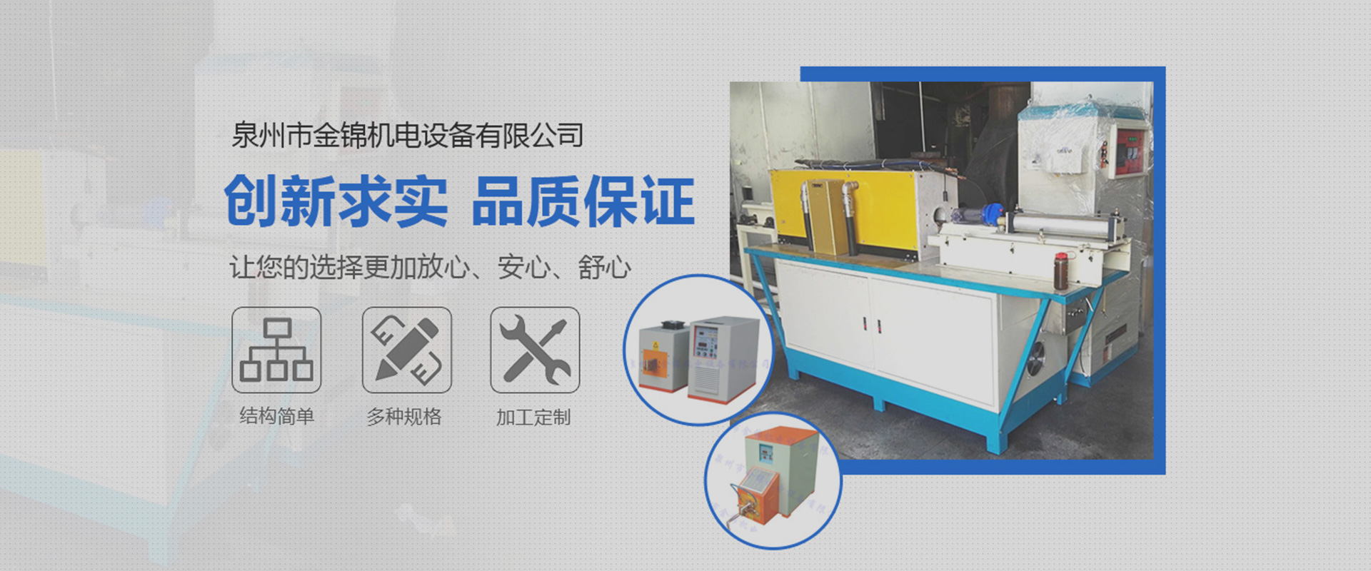??泉州市金錦機電設備有限公司,是一家專業生產銷售感應加熱設備與優化解決方案的高新技術企業。公司自2006年成立以來,以精湛的技術、優質的服務、優良的產品贏得了廣大用戶的認可和信賴。產品銷售于全國各地。公司一貫堅持“立足本職,敢于承擔”的工作作風,秉承“創新求實,品質保證”的經營理念,在感應加熱行業中不斷發光發熱…